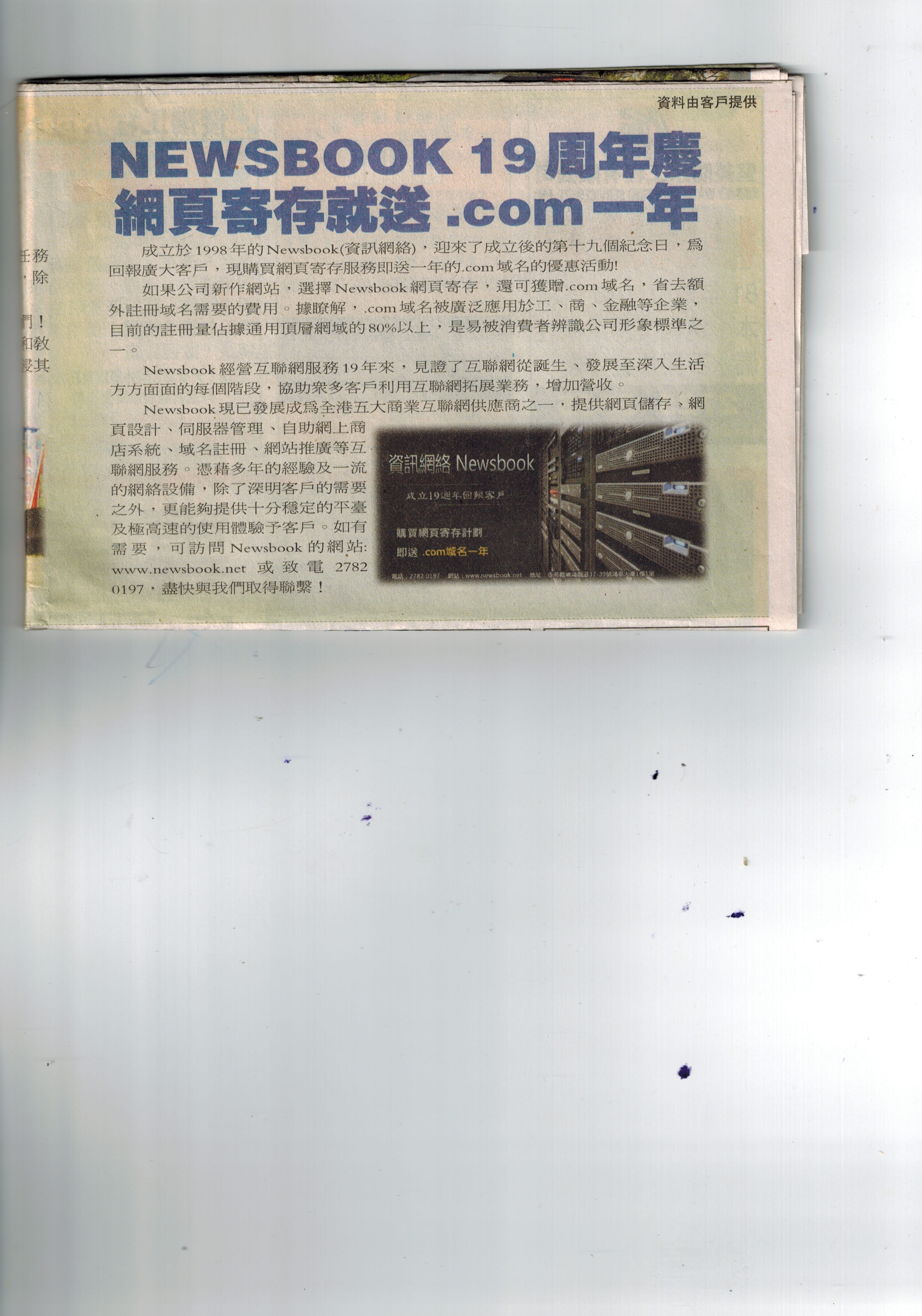 2017年适逢信息网络(Newsbook)有限公司成立19周年,为感谢广大客户的长期支持,现购买公司网页寄存计划,即赠送一年.com域名。目前,Newsbook拥有月费从$38、$48、$68至$680的网页寄存计划共8款,分别对应不同网页储存需求的客户。不论是建立中小企业网站,抑或是个人网站,或大中型网络平台,定有一款适合你。