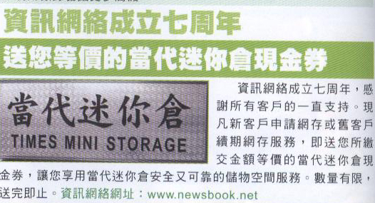 资讯网络成立七周年,感谢所有客户的一直支持。现凡新客户申请网存或旧客户续期网存服务,即送您所缴交金额等价的当代迷你仓现金券,让您享用当代迷你仓安全又可靠的储物空间服务。数量有限,送完即止。
