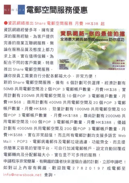 资讯网络是香港最大的网页储存,网页寄存,服务器托管,服务器租用,网页设计公司 资讯网络(Newsbook)是香港最具规模的网页储存商,提供稳定可靠的网页寄存及电邮服务,适合香港,中国及其他地区客户。
