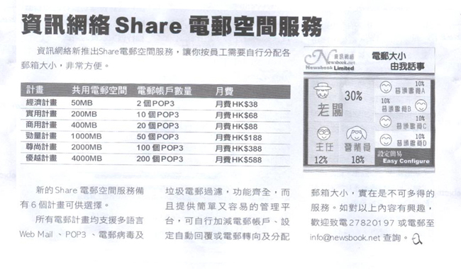 新的Share电邮空间服务,备有 6个计划可供选择。经济计划有50MB共用电邮空间及2个POP 3电邮帐户数量,月费HK$38 ; 实用计划有200MB共用电邮空间及10个POP 3电邮帐户数量,月费HK$68 ; 商用计划有400MB共用电邮空间及20个POP 3电邮帐户数量,月费HK$88 ; 劲量计划有1000MB共用电邮空间及50个POP 3电邮帐户数量 ,月费HK$188 ; 尊尚计划有2000MB共用电邮空间及100个POP 3电邮帐户数量,月费HK$388 ; 优越计划有4000MB共用电邮空间及200个POP 3电邮帐户数量,月费HK$588,实在非常超值 ! 而且所有电邮计划均支援多语言 Web Mail、POP3、电邮病毒邮件及电邮垃圾过滤,功能齐全,而且提供简单又容易的管理平台,可自行加减电邮帐户、设定自动回覆或电邮转向及分配邮箱大小,实在是不可多得的服务 !