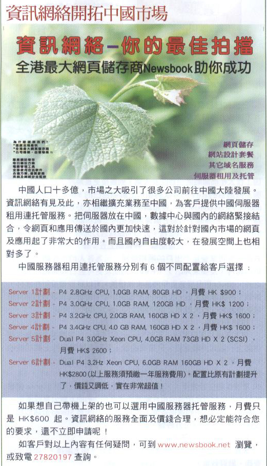 资讯网络是香港最大的网页储存,网页寄存,服务器托管,服务器租用,网页设计公司 资讯网络(Newsbook)是香港最具规模的网页储存商,提供稳定可靠的网页寄存及电邮服务,适合香港,中国及其他地区客户。