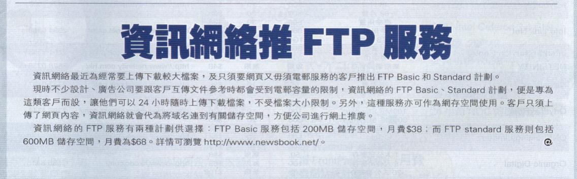 继上星期资讯网络推出电邮计划优惠后,资讯网络最近新推出 FTP Basic、standard 计划,专为经常要上存下载较大档案及只须要网页又不须电邮服务的客户而设,完全体贴客户的不同需要。