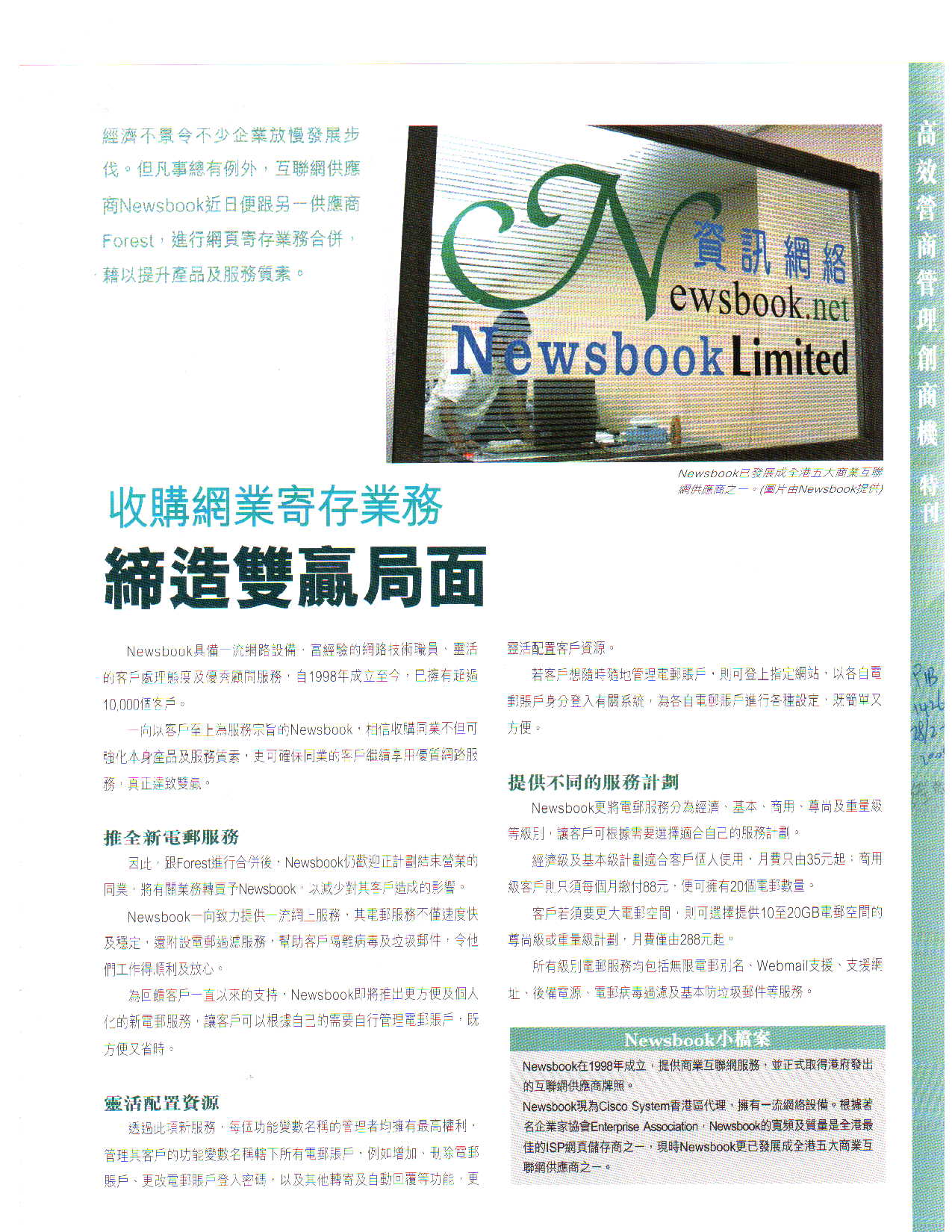 Newsbook 1998 年成立至今已10年,客户增长迅速,至今巳有过万名客户。Newsbook的宽带和质量是全港最佳ISP网页储存商,现在更加发展成为全港五大商业互联网供应商之一。一流的网路设备、富经验的网路技术职员、灵活的客户处理态度及优秀的顾问服务,这些都是Newsbook成功的因素。