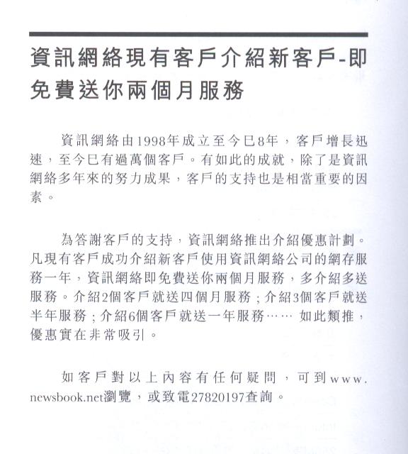 如客户对以上内容有任何疑问,可到www.newsbook.net 浏览,或致电27820197查询。
