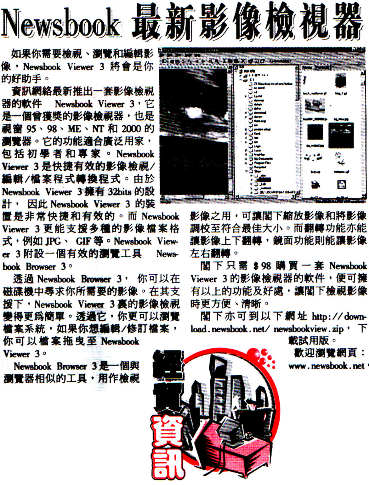 Newsbook最新影像检视器 如果你需要检视、浏览和编辑影像,Newsbook Viewer 3将会伺你的好助手。 信息网络最新推出一套影像检视器的软件 Newsbook Viewer 3,它是一个曾获奖的影像检视器,也是窗口95、98、ME、NT和2000的浏览器。他的功能适合广泛永嘉,包括初学者和专家。Newsbook Viewer 3是快捷有效的影像检视/编辑/档案程序转换程序。由于Newsbook Viewer 3拥有32bits的设计,因此 Newsbook Viewer 3的装置是非常快捷和有效的……