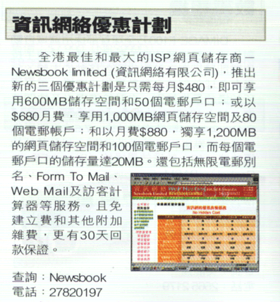 信息网络优惠计划 全港最佳和最大的ISP网页储存商-Newsbook limited(信息网络有限公司),推出新的三个优惠是只需每月$480,即可享用600MB储存空间和50个电邮户口;或以$680月费,享用1,000MB网页储存空间及80个电邮账户;和以月费$880,独享1,200MB的网页储存空间和100个电邮户口,而每个电邮户口得储存量达20MB。还包括无限电邮别名、Form To Mail、Web Mail及访客计算器等服务。且免建立费和其它附加杂费,更有30天回款保证。