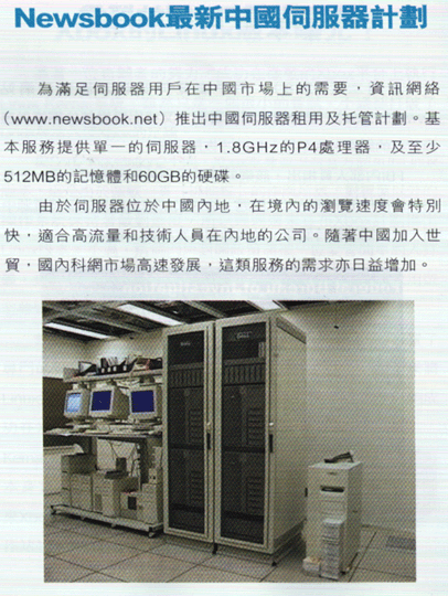 Newsbook最新中国服务器计划 为满足服务器用户在中国市场上的需要,信息网络(www.newsbook.net)推出中国服务器租用及托管计划。基本服务提供单一的服务器,1.8GHz\的P4处理器,及至少512MB的内存和60GB的硬盘。 由于服务器位于中国内地,在境内的浏览速度会特别快,适合高流量和技术人员在内地的公司。随着中国加入世贸,国内科网市场高速发展,这类服务的需求亦日益增加。