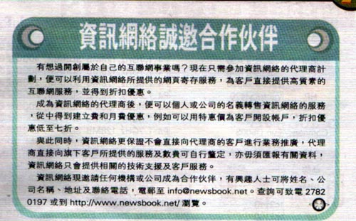 有想过开创属于自己的互联网事业吗?现在自需参加资讯网络的代理商计划,便可以利用资讯网络所提供的网页寄存服务,为客户直接提供高质素的互联网服务,并得到折扣优惠。