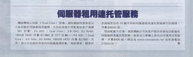 最近,双核心技术 (Dual Core) 登场 - 提供更高运算效能,为不同规模的客户提供一个可扩展的根基。资讯网络有见此新科技对客户带来的好处,特意率先引入了此双核心技术于服务器租用服务,分别有2个不同配置给客户选择 : S61 计划 - P4 820 (Dual Core) 2.8 GHz, 2G RAM, 160GB HDD 月费 HK $1980 及 S71计划 - P4 830 (Dual Core) 3.0 GHz, 2G RAM, 160GB HDD 月费 HK$ 2080,要尝下新技术的效能就马上申请吧!
