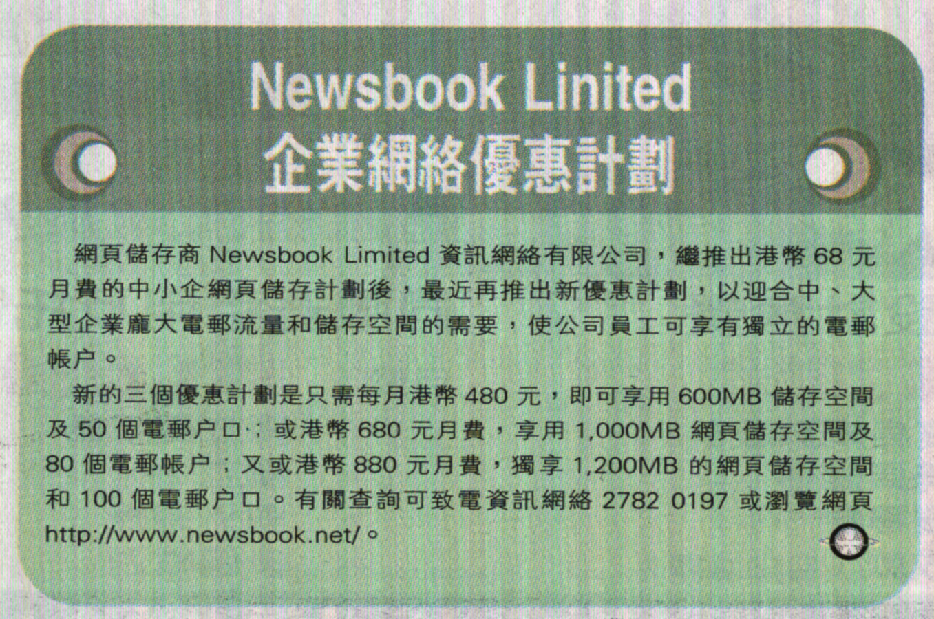 资讯网络是香港最大的网页储存,网页寄存,服务器托管,服务器租用,网页设计公司 资讯网络(Newsbook)是香港最具规模的网页储存商,提供稳定可靠的网页寄存及电邮服务,适合香港,中国及其他地区客户。