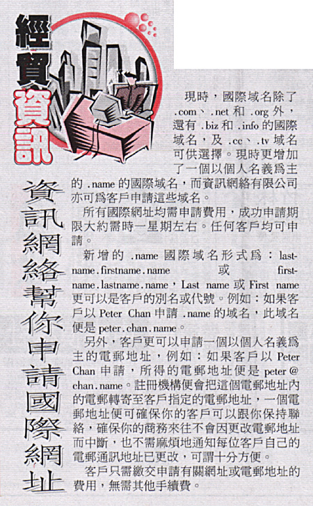 信息网络帮你申请国际域名 现时,国际域名除了.com、.net和.org外,还有.biz、.info的国际域名,及.cc、.tv域名可供选择。现时更增加了.name的国际域名,而信息网络有限公司亦可为客户色情这些域名。 所有国际网址均需申请费用,成功申请期限大约需要一星期左右。任何客户均可申请。 新增的.name国际域名形式为:lastname-firstname.com或firstname.lastname.com,Last name或First name更可以是客户的别名或代号。例如:如果客户以Peter Chan申请.name的域名,此域名便是peter.chan.