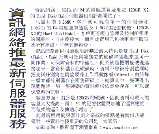 信息网络推最新服务器服务 信息网络1.8GHz的P4的计算机运算速度之120GB X2的Hard Disk(Raid)服务器租用计划开航了。 只需月费$2680,客户便可拥有单一的服务器和1.8GHz的P4计算机运算及1.5G的记忆软件、2360GB X2的Hard Disk(Raid)。客户更可亲自管理及控制所租用的服务器,自由度极大,而且此费用已包括服务器及所有联机,并无其它杂费。 信息网络此服务器租用计划之最大特色伺双Hard Disk(Raid),Raid系统可把两只独立的硬盘串联起来并可一同作业麦克保障数据的准确性……