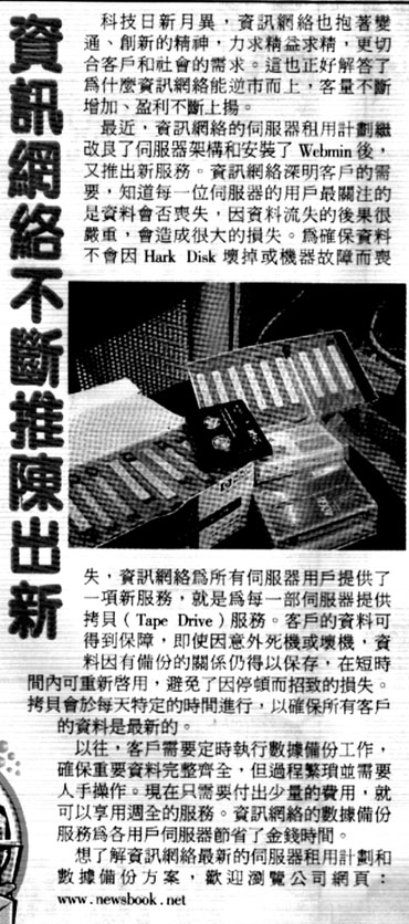 最近,资讯网络的服务器租用计划继改良了服务器架构和安装了Webmin后,又推出新计划。资讯网络深明客户的需要,知道每一位服务器的用户最关注的伺资料会否丧失,因资料流失的后果很严重,会造成很大的损失。为确保资料不会因为Hark Disk坏掉或及其故障而网络为所有服务器用户提供了一项新服务……