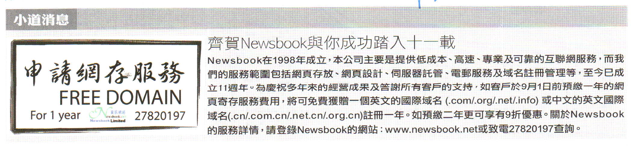资讯网络是香港最大的网页储存,网页寄存,服务器托管,服务器租用,网页设计公司 资讯网络(Newsbook)是香港最具规模的网页储存商,提供稳定可靠的网页寄存及电邮服务,适合香港,中国及其他地区客户。