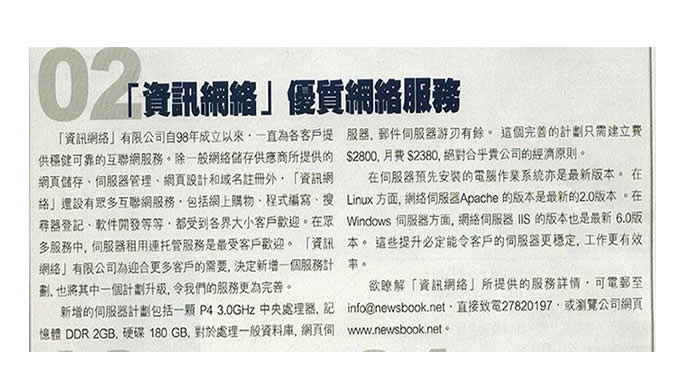 资讯网络是香港最大的网页储存,网页寄存,服务器托管,服务器租用,网页设计公司 资讯网络(Newsbook)是香港最具规模的网页储存商,提供稳定可靠的网页寄存及电邮服务,适合香港,中国及其他地区客户。