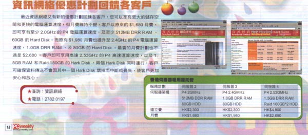 资讯网络优惠计划回馈各客户 最近资讯网络又有新的优惠计划回馈各客户,您可以享有更大的储存空间和更快的电脑速算速度,但月费不变,客户以原来的$1, 680月费,即可现有至少2.0GHz的P4电脑速算速度,及至少512MB DRR RAM、60GB的Hatd Disk。而原有$1980月费也提升之2.4GHz的P4电脑速算速度,1.0GB DRR RAM,及80GB的Hard Disk。最贵的月费计划也不过是$2,680…… |