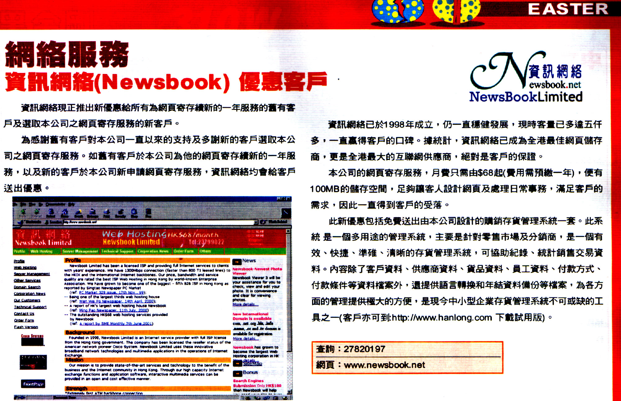 网络服务 信息网络(Newsbook)优惠客户 信息网络现正推出新优惠给所有网页寄存续新的一年服务的旧有客户及选取本公司之网页寄存服务的新客户。 为感谢旧有客户对本公司一直以来的支持及多谢新的客户选取本公司之网页寄存服务。如旧有客户于本公司为他的网页寄存续新的一年服务,以及新的客户于本公司新申请网页寄存服务,信息网络均会给客户送出优惠……