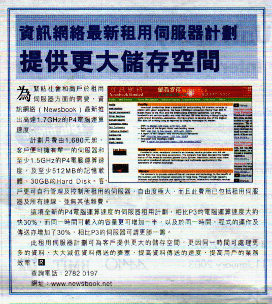 資訊網絡最新租用服务器計劃 提供更大儲存空間 為緊貼社會和商戶於租用服务器方面的需要,資訊網絡(Newsbbok)最新推出告訴1.7GHz的P4電腦運算速度。 計劃月費由1,680元器,客戶便可擁有單一的服务器和至少1.5GHz的P4電腦運算速度,及至少512MB的記憶軟體、30GB的Hard Disk。客戶更可自行管理及控制所租用的服务器,自由度極大,而且次費用一包括租用服务器及所有聯想,并無其他雜費。 這項全新的P4電腦運算速度的服务器租用計劃,相比P3的電腦運算速度大約快30%,而同一時間可載入的容量更可增加一半,以及於同一時間,程式的運作及傳送亦增加了30%,相比P3的服务器可謂更勝一籌……