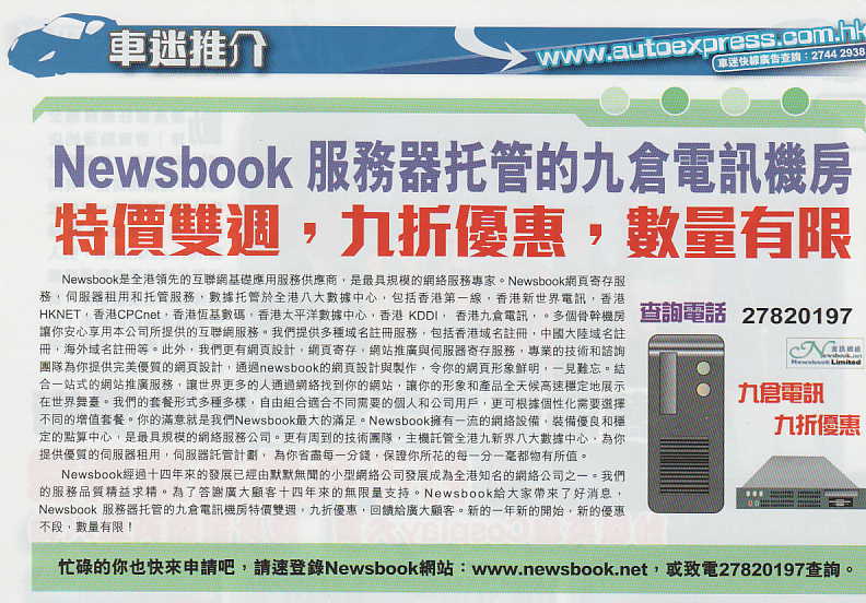 资讯网络是香港最大的网页储存,网页寄存,服务器托管,服务器租用,网页设计公司 资讯网络(Newsbook)是香港最具规模的网页储存商,提供稳定可靠的网页寄存及电邮服务,适合香港,中国及其他地区客户。