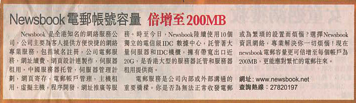 电邮服务是公司内部或外部沟通的重要桥梁。你是否为无法正常收发电邮或为繁琐的设置而烦恼?选择Newsbook资讯网络,专业解决你一切烦恼!现在newsbook电邮容量更可倍增至每个帐户为200MB,更能应对繁忙的电邮往来。你都快来申请吧!