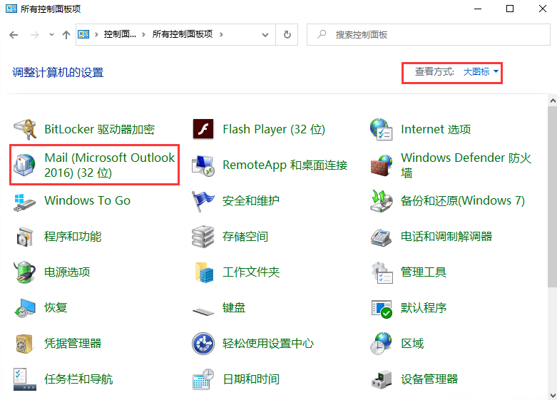 02 查看方式为"大图标"的情况下,选择"Mail(Microsoft Outlook 2016)".