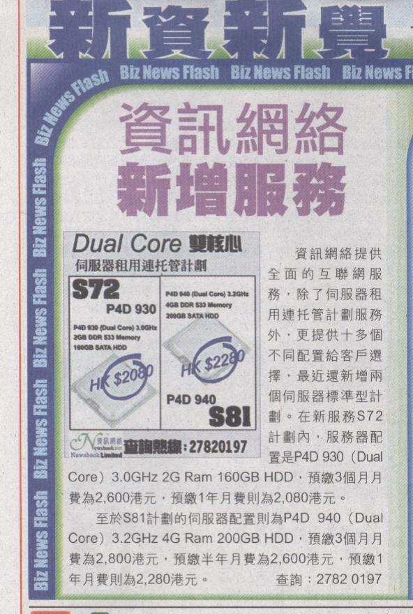 S72 new service plan, the server configuration is P4D 930 (Dual Core) 3.0GHz 2G Ram 160GB HDD, prepaid monthly fee for 3 months is HK $ 2600; prepaid monthly fee for half a year is HK $ 2400; prepaid a year fee is HK $ 2080. S81 program, server configuration is P4D 940 (Dual Core) 3.2GHz 4G Ram 200GB HDD, prepaid monthly fee for 3 months is HK $ 2800; prepaid monthly fee for half a year is HK $ 2600; prepaid monthly fee for a year is HK $ 2280. In addition, as a result of service changes, S71 service programs have been canceled. Besides the original server hosting even hire scheme, newsbook also welcome customers asking about the price of configuration.