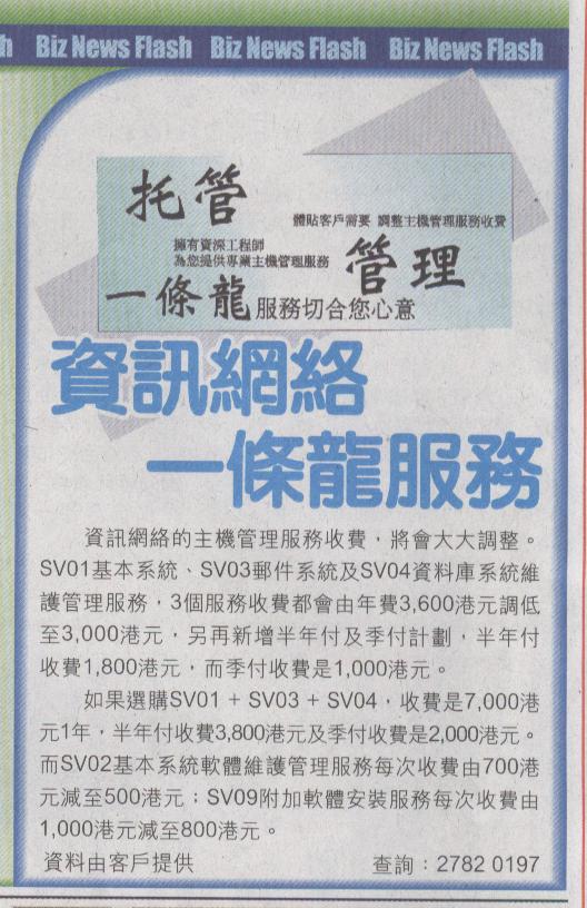 To show the sincerity of the newsbook service, from now on, the host management service fees will be adjusted significantly. SV01 basic system (WEB + FTP) maintenance management, SV03 mail system (MAIL) and SV04 maintenance management database system (SQL / MySQL) maintenance and management services,these three services will be met by the annual fee from HK $ 3600 reduced to HK $ 3000. And new add the discount of payment in 6 months or 3 months. payment for 6 months fee is HK $ 1800 and payment for 3 months fee is HK $ 1000. If purchased all the SV01 + SV03 + SV04 at the same time, fees are HK $ 7000 a year, HK $ 3800 half year and HK $ 2000 3 months. The charge of SV02 basic system and software maintenance management services is from HK $ 700 reduced to HK $ 500; charge of SV09 additional software installation service is from HK $ 1000 reduced to HK $ 800. And hardware even providing fire service plans fee is HK $ 3600, together with the pay plan of monthly or seasonal, fees were HK $ 2100 or HK $ 1050.