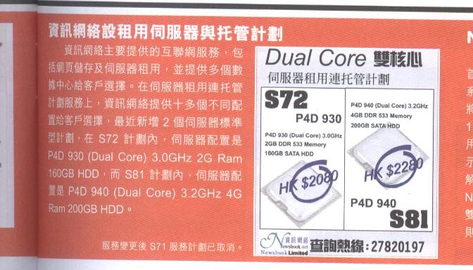 S72 new service plan, the server configuration is P4D 930 (Dual Core) 3.0GHz 2G Ram 160GB HDD, prepaid monthly fee for 3 months is HK $ 2600; prepaid monthly fee for half a year is HK $ 2400; prepaid a year fee is HK $ 2080. S81 program, server configuration is P4D 940 (Dual Core) 3.2GHz 4G Ram 200GB HDD, prepaid monthly fee for 3 months is HK $ 2800; prepaid monthly fee for half a year is HK $ 2600; prepaid monthly fee for a year is HK $ 2280. In addition, as a result of service changes, S71 service programs have been canceled. Besides the original server hosting even hire scheme, newsbook also welcome customers asking about the price of configuration.