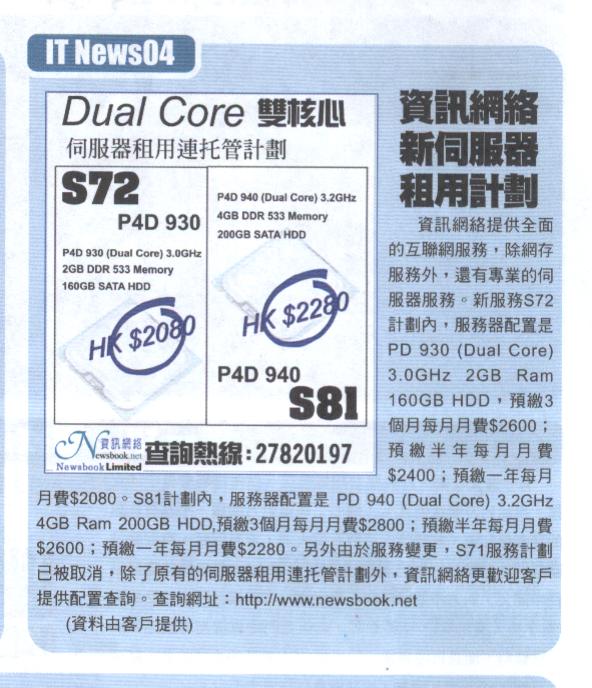S72 new service plan, the server configuration is P4D 930 (Dual Core) 3.0GHz 2G Ram 160GB HDD, prepaid monthly fee for 3 months is HK $ 2600; prepaid monthly fee for half a year is HK $ 2400; prepaid a year fee is HK $ 2080. S81 program, server configuration is P4D 940 (Dual Core) 3.2GHz 4G Ram 200GB HDD, prepaid monthly fee for 3 months is HK $ 2800; prepaid monthly fee for half a year is HK $ 2600; prepaid monthly fee for a year is HK $ 2280. In addition, as a result of service changes, S71 service programs have been canceled. Besides the original server hosting even hire scheme, newsbook also welcome customers asking about the price of configuration.