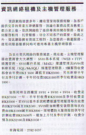 To show the sincerity of the newsbook service, from now on, the host management service fees will be adjusted significantly. SV01 basic system (WEB + FTP) maintenance management, SV03 mail system (MAIL) and SV04 maintenance management database system (SQL / MySQL) maintenance and management services,these three services will be met by the annual fee from HK $ 3600 reduced to HK $ 3000. And new add the discount of payment in 6 months or 3 months. payment for 6 months fee is HK $ 1800 and payment for 3 months fee is HK $ 1000. If purchased all the SV01 + SV03 + SV04 at the same time, fees are HK $ 7000 a year, HK $ 3800 half year and HK $ 2000 3 months. The charge of SV02 basic system and software maintenance management services is from HK $ 700 reduced to HK $ 500; charge of SV09 additional software installation service is from HK $ 1000 reduced to HK $ 800. And hardware even providing fire service plans fee is HK $ 3600, together with the pay plan of monthly or seasonal, fees were HK $ 2100 or HK $ 1050.