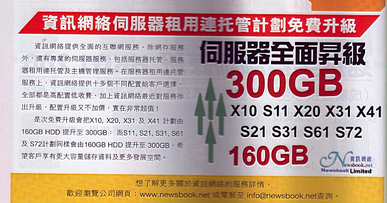 To show the sincerity of the newsbook service, from now on, the host management service fees will be adjusted significantly. SV01 basic system (WEB + FTP) maintenance management, SV03 mail system (MAIL) and SV04 maintenance management database system (SQL / MySQL) maintenance and management services,these three services will be met by the annual fee from HK $ 3600 reduced to HK $ 3000. And new add the discount of payment in 6 months or 3 months. payment for 6 months fee is HK $ 1800 and payment for 3 months fee is HK $ 1000. If purchased all the SV01 + SV03 + SV04 at the same time, fees are HK $ 7000 a year, HK $ 3800 half year and HK $ 2000 3 months. The charge of SV02 basic system and software maintenance management services is from HK $ 700 reduced to HK $ 500; charge of SV09 additional software installation service is from HK $ 1000 reduced to HK $ 800. And hardware even providing fire service plans fee is HK $ 3600, together with the pay plan of monthly or seasonal, fees were HK $ 2100 or HK $ 1050.