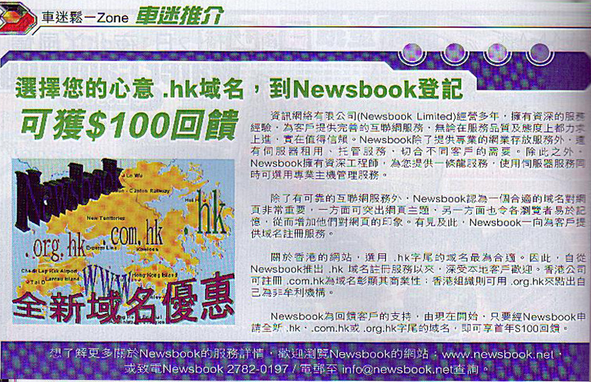 Into the operation of the ninth, Newsbook launch discount of domain name registration, to celebrate the joy of the 8th anniversary with customer, Newsbook new applications in domain name. Hk, the first year of registration fees discount by half to HK$ 100. On the Web site of Hong Kong, choose. Hk domain name is most appropriate. Hong Kong companies can be registered. Com.hk domain name of their business for demonstrated; Hong Kong organizations available in the. Org.hk to point out their own non-profit-making institutions; educational bodies in Hong Kong could be considered. Edu.hk. After make a decision of web site, customers can consider Newsbook professional web design services, establish an easy-to-use and attractive website. Newsbook web design to meet the needs of different sites, from general information to the interactive nature of web page design web design web-based services (such as shopping baskets) are readily available, fees are very value! Stability with high-quality website of Newsbook storage services (monthly fee just only from HK$ 48), the customer's Web site will attract people to browse, help your business in promoted.