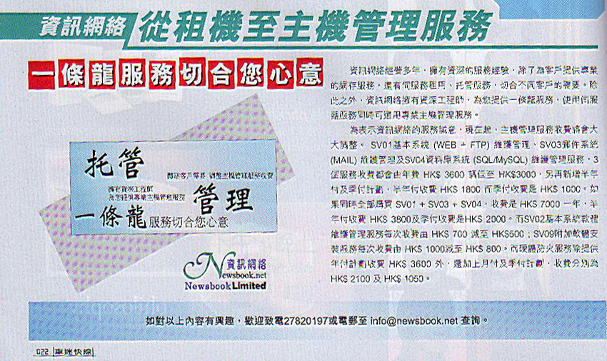 To show the sincerity of the newsbook service, from now on, the host management service fees will be adjusted significantly. SV01 basic system (WEB + FTP) maintenance management, SV03 mail system (MAIL) and SV04 maintenance management database system (SQL / MySQL) maintenance and management services,these three services will be met by the annual fee from HK $ 3600 reduced to HK $ 3000. And new add the discount of payment in 6 months or 3 months. payment for 6 months fee is HK $ 1800 and payment for 3 months fee is HK $ 1000. If purchased all the SV01 + SV03 + SV04 at the same time, fees are HK $ 7000 a year, HK $ 3800 half year and HK $ 2000 3 months. The charge of SV02 basic system and software maintenance management services is from HK $ 700 reduced to HK $ 500; charge of SV09 additional software installation service is from HK $ 1000 reduced to HK $ 800. And hardware even providing fire service plans fee is HK $ 3600, together with the pay plan of monthly or seasonal, fees were HK $ 2100 or HK $ 1050.