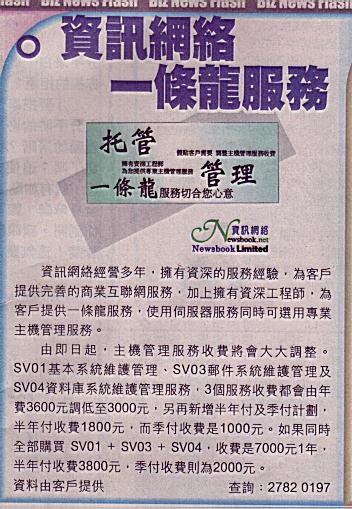 To show the sincerity of the newsbook service, from now on, the host management service fees will be adjusted significantly. SV01 basic system (WEB + FTP) maintenance management, SV03 mail system (MAIL) and SV04 maintenance management database system (SQL / MySQL) maintenance and management services,these three services will be met by the annual fee from HK $ 3600 reduced to HK $ 3000. And new add the discount of payment in 6 months or 3 months. payment for 6 months fee is HK $ 1800 and payment for 3 months fee is HK $ 1000. If purchased all the SV01 + SV03 + SV04 at the same time, fees are HK $ 7000 a year, HK $ 3800 half year and HK $ 2000 3 months. The charge of SV02 basic system and software maintenance management services is from HK $ 700 reduced to HK $ 500; charge of SV09 additional software installation service is from HK $ 1000 reduced to HK $ 800. And hardware even providing fire service plans fee is HK $ 3600, together with the pay plan of monthly or seasonal, fees were HK $ 2100 or HK $ 1050.