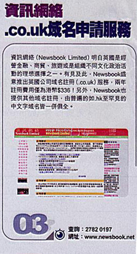Newsbook business for many years and have experience in senior services providing clients with comprehensive commercial and personal Internet services, in terms of quality of service and attitude are constantly strive to enrich it is trustworthy. Would you like to establish a web site, first register a Newsbook domain name and open storage space for it! Please contact Newsbook ordering inquiries and Newsbook ─ related services Tel: 2782 0197, e-mail: info@newsbook.net, Web site: http://www.newsbook.net.