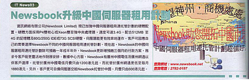 Newsbook (Newsbook Limited) server rental hosting plan has always been well received by different kinds of customers. Newsbook servers are equipped with advanced hardware; both in speed and stability are superior. As the place of data center servers have a first-class security and safety measures, so customers can feel at ease about the management of servers, no longer to worry about server security issues. So it is wise decision to choose Newsbook. Newsbook as early as in 2000 launched a China server hosting plans and rented a server hosted in China plans. It is gives you more time, to open up the huge Mainland market faster. Since the launch, is most welcome.