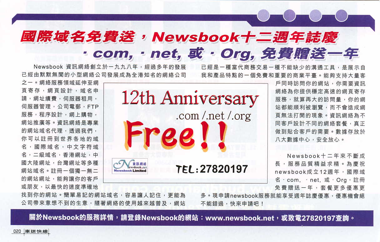 For celebrating Newsbook's 12th year anniversary, free .com,.net or .org domain registration one year for gift.